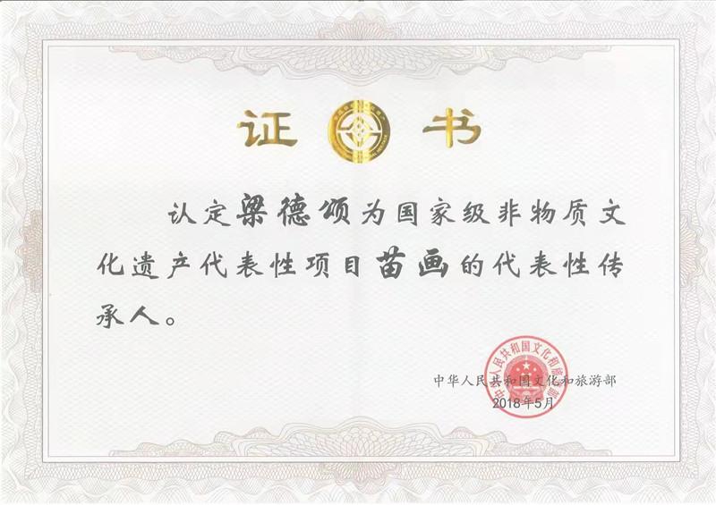 梁德颂,男,苗族,1964年11月出生保靖县水田河镇白合村,受父辈耳濡目染,他继承家传,从小开始学苗画。擅长喜庆、吉祥、长寿、友谊等吉祥图案,民间传说、神话故事等。2018年5月评为《苗画》国家级级代表性传承人。